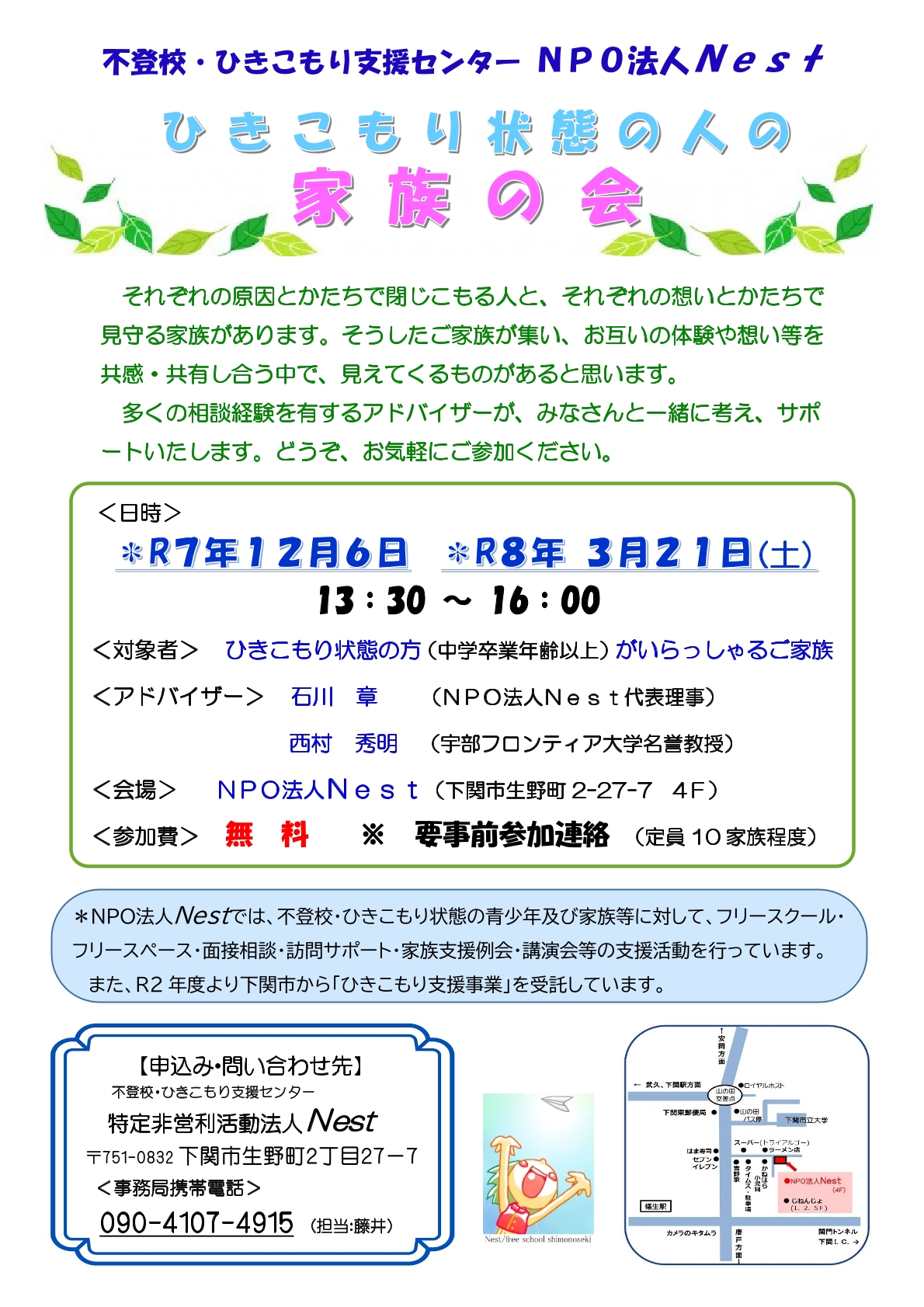 この度、下関市ひきこもり支援事業の一環として、「ひきこもり状態の人の家族の会」を、参加費無料で下記のとおり開催することにいたしました。