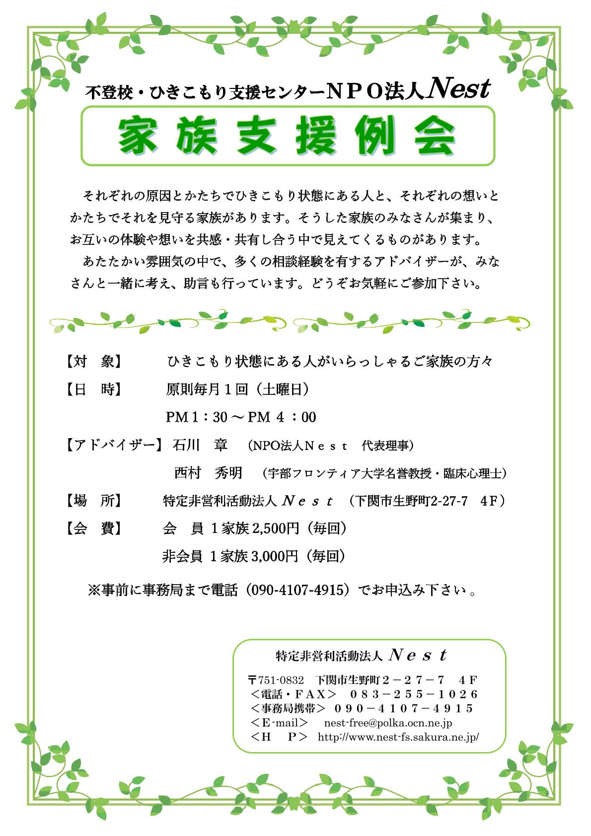 家族支援例会 開催:毎月1回 土曜日 13:30~16:00 月会費:有 ひきこもり状態にある人をお持ちのご家族へ、毎月1回、専門家によるアドバイスを受けながらの家族支援例会を開いています。 ↓画像クリックで拡大します。 フリースクール下関開催:月曜日・火曜日・水曜日・木曜日・金曜日 不登校・ひきこもり状態にあるこども続きを読むフリースペースNest (下関市委託事業含む)開催: 毎週 火曜日 11:00~13:00 13:00~15:0続きを読むNest学習会 (下関市委託事業)詳しくはお問い合わせください。 (担当:藤岡) 続きを読む初回相談不登校・ひきこもりに関する相談は無料(随時受付・要予約)(50分) 続きを読む面接相談・訪問サポート (下関市委託事業含む)概要:随時受付、要予約 不登校・ひきこもりの他、家族関係等あらゆる続きを読むサポート養成講座概要:サポーターの育成 開催:連続講座(R7年度・5回) 不登校・ひきこもり状態続きを読む講演会講演会:年1回 不登校・ひきこもり状態にあるこどもたちや若者をサポ続きを読む講師派遣開催:随時 不登校・ひきこもり状態の子どもたちや青年たちへの理解や続きを読むお母さんの会開催日:毎月1回 10:30~13:00(原則) 利用料:無料(利用会員のみ) 続きを読む